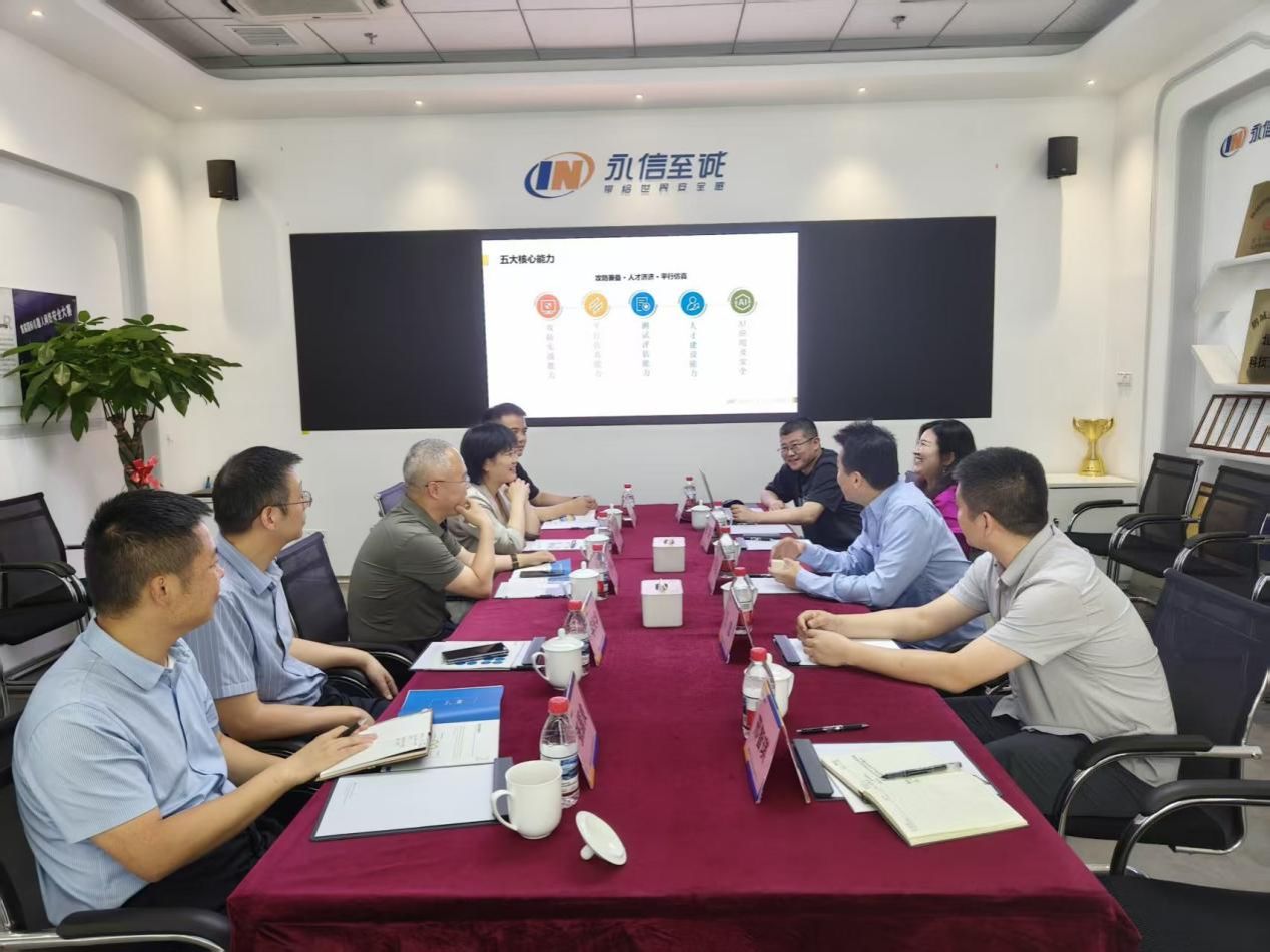 随后,调研组一行前往永信至诚科技集团股份有限公司总部,与公司董事长蔡晶晶、首席技术官张凯等座谈交流。永信至诚首席技术官张凯首先从公司概况、核心业务能力、重点产品与服务等方面对公司进行了介绍。永信至诚董事长蔡晶晶表示,公司聚焦网络与数据安全创新,首创数字风洞产品体系和高仿真网络靶场平台,建立了多场景人才培养体系,希望能与学院建立常态化合作机制,为数字中国建设提供专有人才支撑。李青山、张美茹分别介绍学院情况并一致认为,两个学院将不断发挥学科优势加强开拓融合,以工程应用为牵引,深化产学研合作,增强校企协同育人能力,支撑计算机与网络安全人才培养,增进学生对计算机与网络安全行业头部企业的了解,引导学生主动服务国家战略。